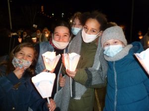 Après la prière du matin qui rassembla toutes les élèves sous le préau et un très bon repas de midi, d’autres temps forts ont marqué cette fête : la chorégraphie dynamique présentée en début d’après-midi avec le « chant de promo », l’Eucharistie au Sanctuaire en fin d’après-midi et, pour les pensionnaires, la procession aux flambeaux en soirée. Un peu tremblantes sous le froid – heureusement, la pluie avait eu la bonne idée de s’arrêter – les nouvelles élèves écarquillaient les yeux devant le spectacle de tous ces petits lumignons et chacune tentait de garder son flambeau allumé, ce qui n’était pas facile avec le vent… Enfin, la prière à l’espace polyvalent, joyeuse et recueillie, conclut cette journée.